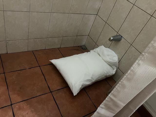 might wonder why i had a drenched bed pillow in a case hanging to dry in the shower