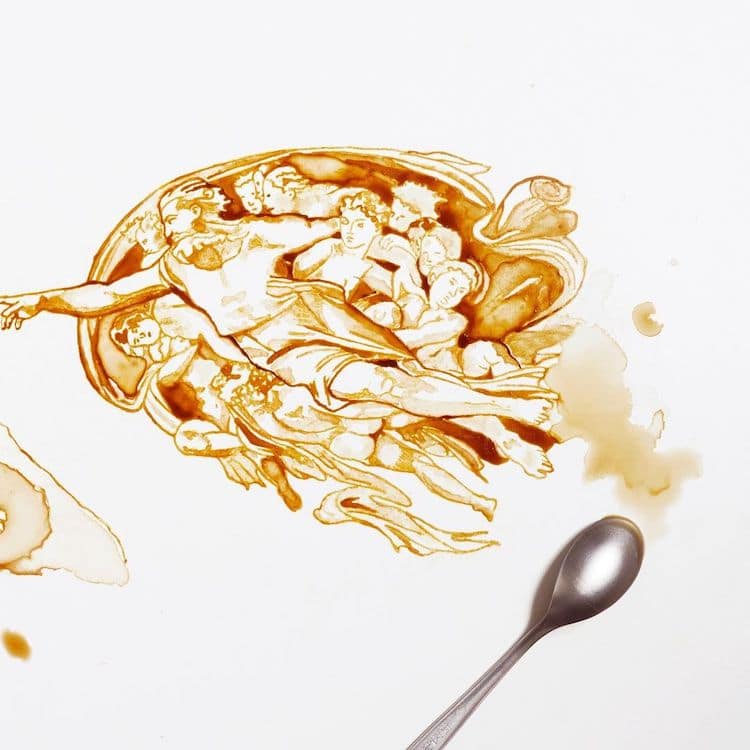 Today, Bernardelli continues to use spoons in lieu of a paint brush, but she also uses matchsticks to achieve intricate details. From architectural sketches to studies of the human face, Bernardelli takes inspiration from everywhere. She even recreates Italian Renaissance masterpieces in her coffee art style. She’s “painted” the Mona Lisa and The Creation of Adam, using spilled coffee as pigment.