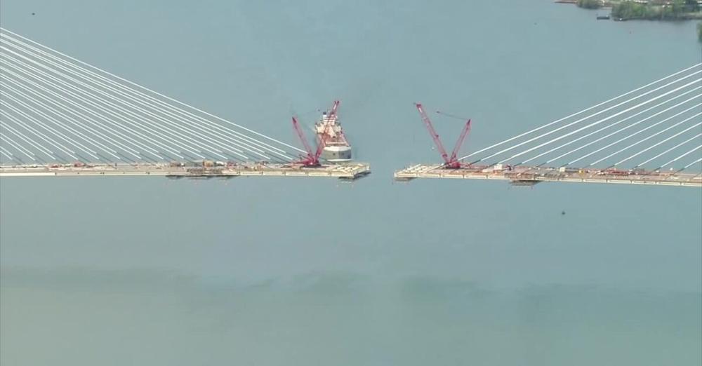 Scene from above the Gordie Howe International Bridge (between Detroit, Michigan, USA and Windsor, Ontario, Canada), as the two sides of the bridge are nearing connection. The bridge gap between the two sides is just over 200 feet and will be connected next year. In this case, really close, is still not close enough –
