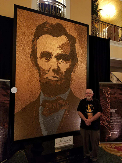 “A. Lincoln” is a 96-square-foot (eight feet wide by 12 feet tall) portrait of the 16th President of the United States, consisting of 24,500 pennies and five pounds of glue that altogether weighs approximately 400 pounds. Each year of the coin series is represented, from 1909 through 2017, and each cent is unaltered in any way. Schlatter stated that he sorted through tens of thousands of pennies to get the colors he needed–including 1,681 steel cents produced during World War II to conserve copper for the war effort that eventually became Lincoln’s shirt.