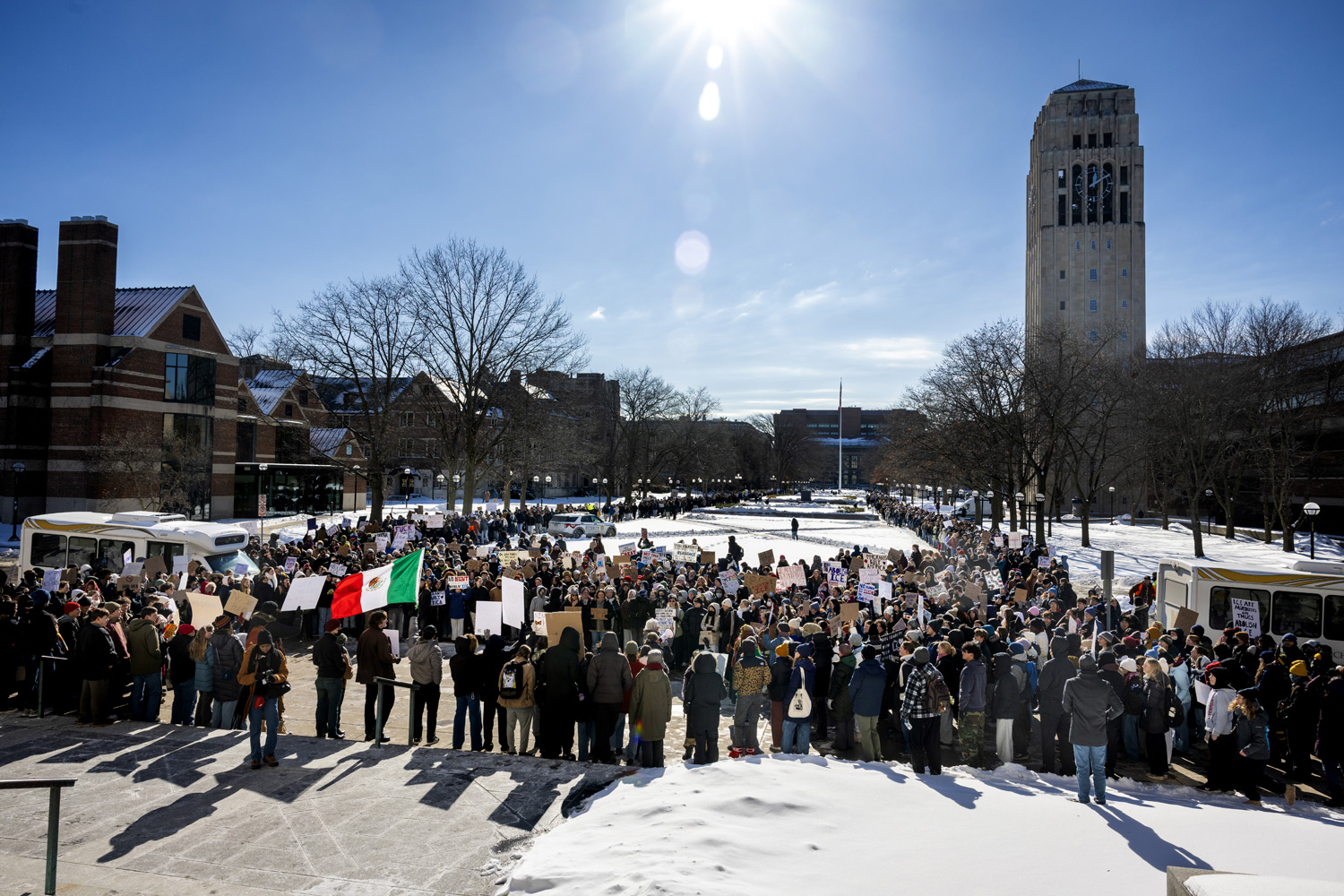 2,000+ students and local residents gathered on the university of michigan diag in ann arbor and marched across campus and through the city to protest the administration’s use of Immigration and Customs Enforcement in michigan and across the nation.