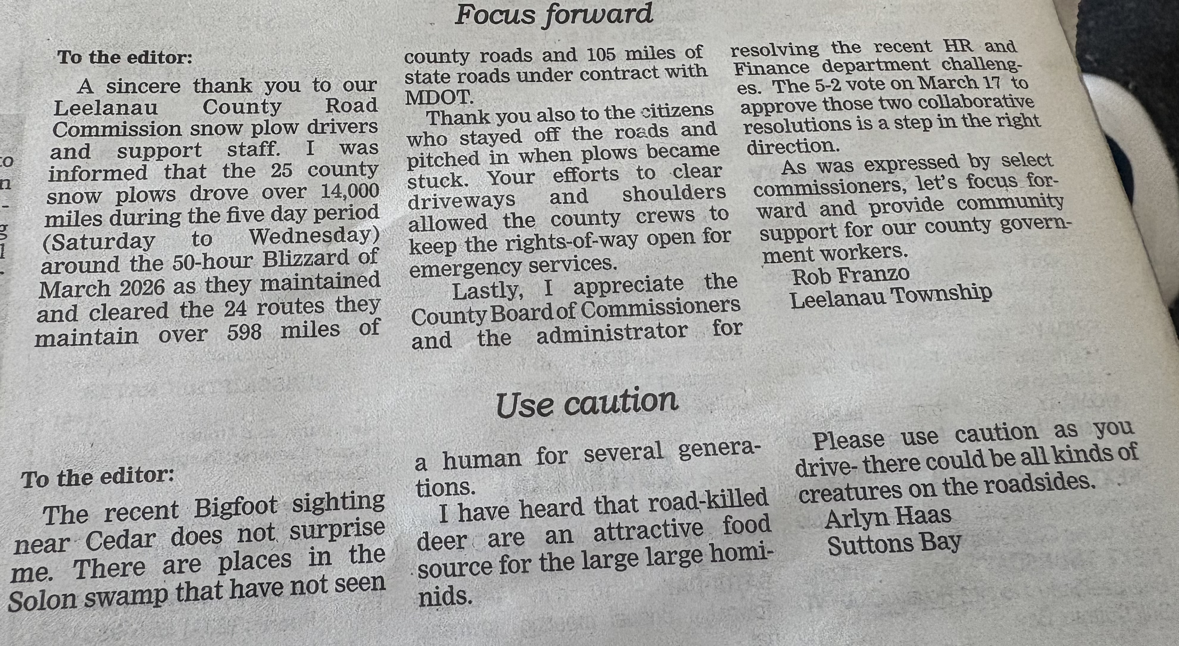 a casual observation about a recent local big foot sighting, simply advising the other locals to use caution, no big worries.