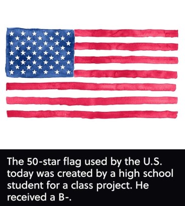 The designer of our current 50-star flag was Robert Heft. It was 1958 and there was some talk that Alaska and Hawaii were going to officially become states 49 and 50. One of his high school teachers capitalized on the current events of the day and had his students design a new flag incorporating the two new states. Inspired by Betsy Ross, (and cutting up his parents’ flag), Heft did just that, arranging the stars so it wasn’t very evident that he had added any. His teacher gave him a B-, saying that the design was unoriginal. When Heft balked at the grade, his teacher told him that if he could get the flag adopted by Congress, he would bump the grade up to an A. Heft jumped at the opportunity, sent the flag to his congressman, and after a long campaign and a refusal to give up, he ended up getting the flag approved. Heft got his ‘A’ as promised. Since then, Heft’s original homemade flag has flown over every single state capitol building, over 88 U.S. embassies, and over the White House for five administrations. He is now deceased, but has left behind a design with 51 stars ready to go if the need arises.