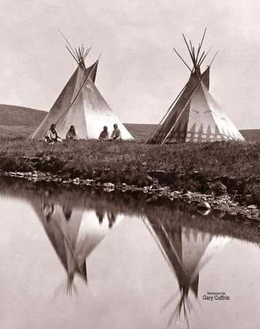 At The Water’s Edge, 1910. Edward S. Curtis photographed Piegan tepees at the Blackfeet Indian Reservation in northwest Montana. The Reservation is bordered by Canada to the north and Glacier Park to the west. Browning, site of tribal headquarters, has an average of 196 days per year with temperatures below freezing.
