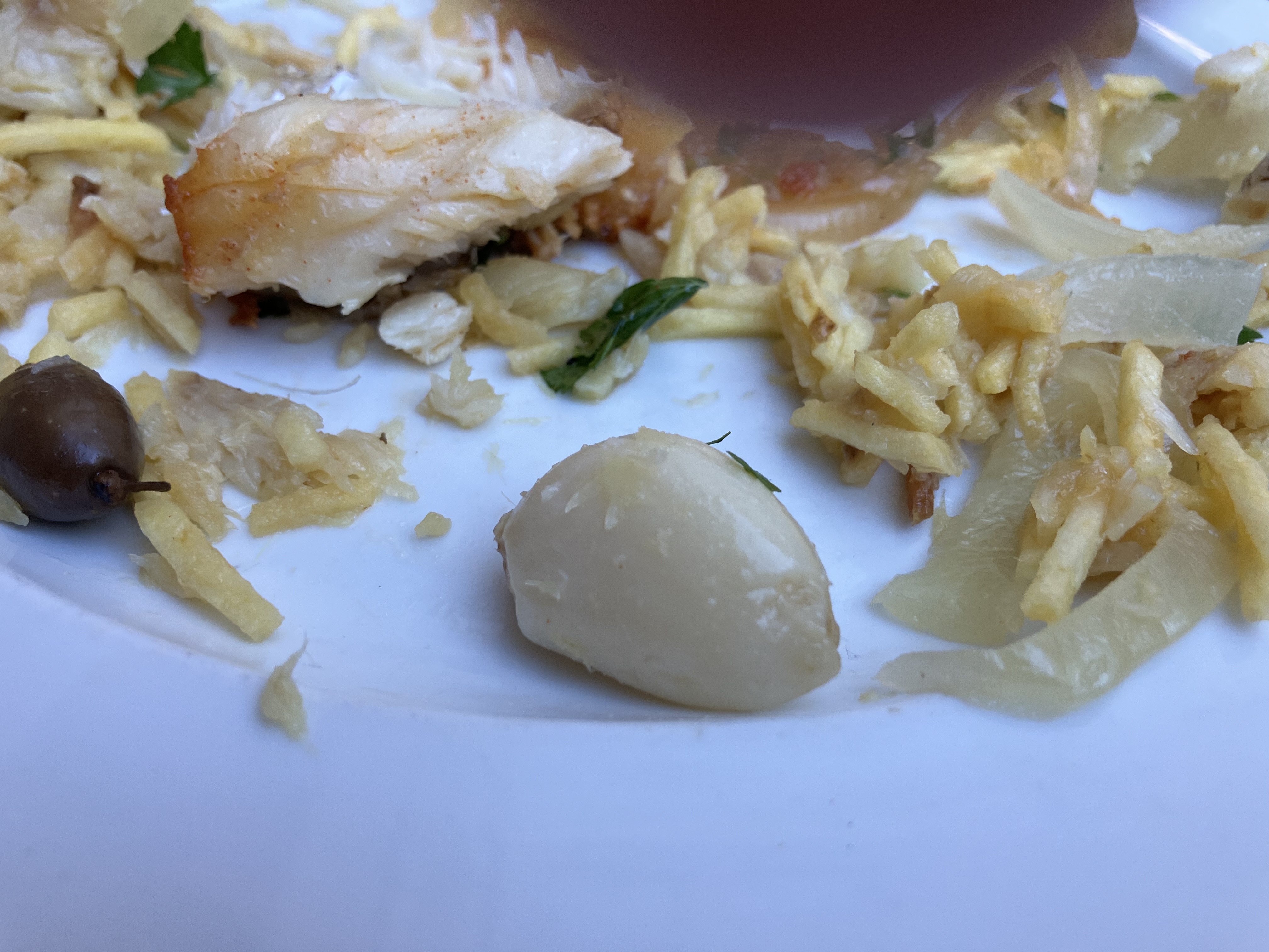 fish, and rice, and olives, and herbs, and the biggest clove of garlic ever