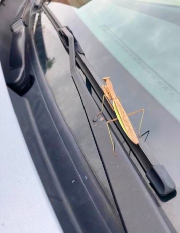 the mantis hopped up on the windshield wiper