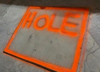 There is a deep hole in the sidewalk.