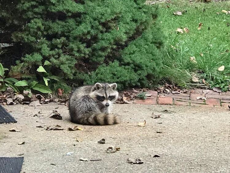 “we found a raccoon in our driveway that looks sad and is not moving.